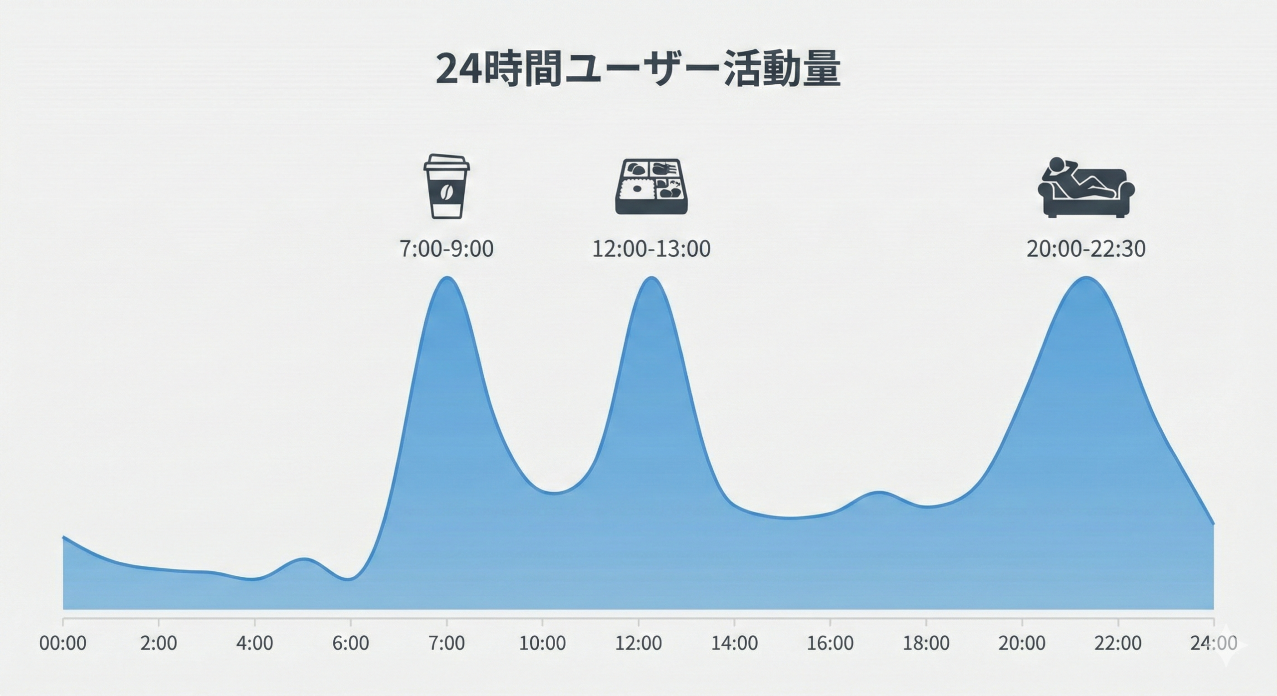 07:00 〜 09:00モーニングタイム起床直後のチェック、通勤・通学中の「情報収集」や「暇つぶし」。短時間で消費できる投稿が好まれる。